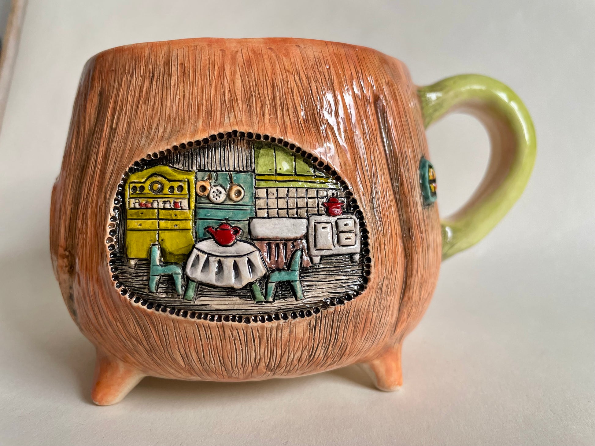 This story telling mug collection is inspired by woodland fables, warm hollow homes and cozy vibes. It is completely hand shaped, sculpted and painted by me, glazed with transparent lead free glaze and was fired at 1050 Celsius. Holds about 450ml / 16 oz US fluid ounces.