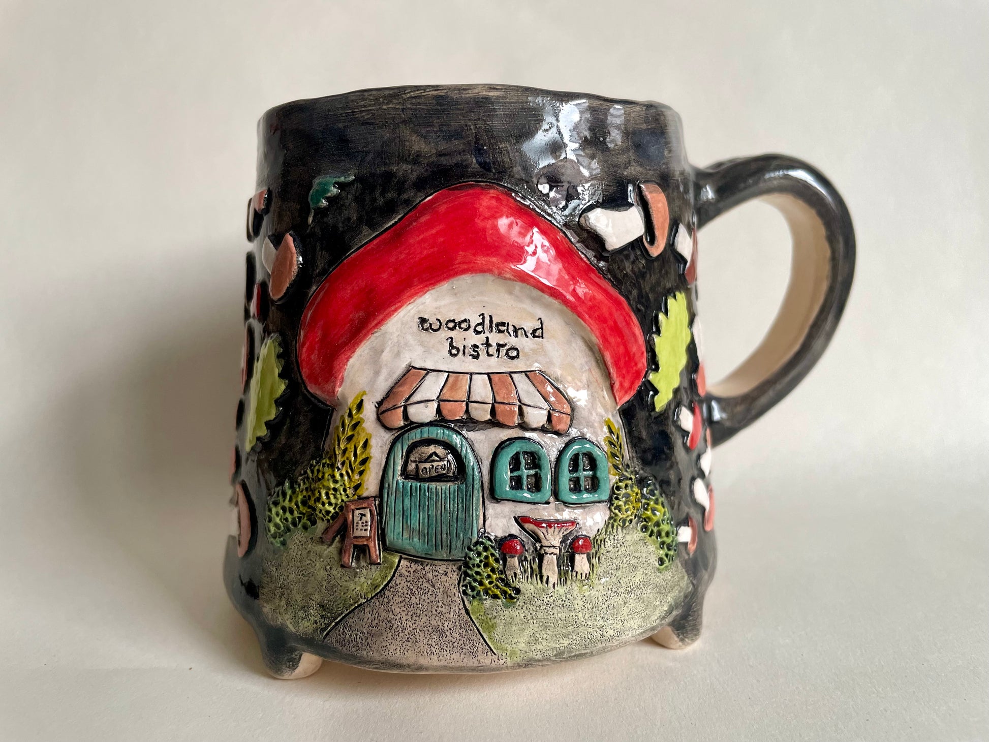 This story telling mug collection is inspired by woodland fables, warm hollow homes and cozy vibes. It is completely hand shaped, sculpted and painted by me, glazed with transparent lead free glaze and was fired at 1050 Celsius. Holds about 350 ml/ 12 US US fluid ounces.